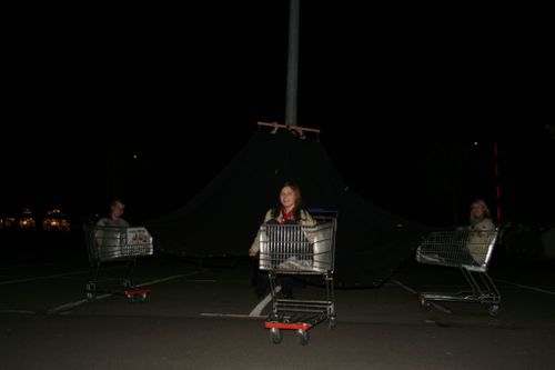 Auf quietschenden Reifen überladener Einkaufswägen vollbringt unsere Kohte "Kunststücke"