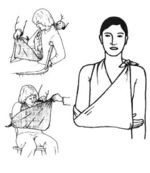 Wenn ein Arm ruhiggestellt werden soll, kann das Halstuch als Schlinge um den Hals gebunden und darin der Arm gelagert werden. Wichtig ist dabei, daß die lange Seite des Halstuchs zur Hand, und die Spitze zum Ellenbogen zeigt.