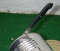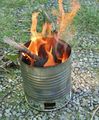 In anderen Anleitungen findet man oft noch Löcher am oberen Dosenrand. Dies soll bewirken, dass man einen Topf auf den Ofen stellen kann. Ich habe festgestellt, dass das Feuer in dem Fall anfängt stark zu rauchen und man kein Holz mehr nachlegen kann. Deshalb habe ich bei dieser Konstruktion auf die Löcher oben verzichtet. Zum Kochen sollte der Topf also klassisch an einem Dreibein aufgehängt werden.