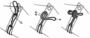 Wenn man am unteren Ende angekommen ist, folgt ein Abschlussknoten. Die folgenden drei Abbildungen zeigen dies. Der Clou dabei ist, dass man quasi eine halbe Schleife knotet, womit der Knoten einfach aufziehbar ist. Andere Knoten, wie zum Beispiel der Achterknoten, würden zwar auch verhindern, dass das Seil durch die Öse rutscht, ist aber oft sehr schwer zu lösen.