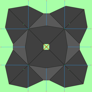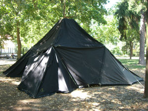 Zuerst werden die Planen zusamengeknüpft, die vier Planen in der Mitte werden getrennt von den anderen zu einer normalen Kohte zusammengeknüpft. Die restlichen Plannen werden immer abwechselnd, zwei Planen richtigrum und ein Plane falschrum zu einem Kreis aus insgesamt 12 Planen geknüpft. Nun legt man die Extrakohte obendrauf und verbindet die vier Ecken (am besten mit Jurtenschrauben) mit jeweils zwei Ecken an denen eine normale Planen an einen umgedrehte stößt(siehe Zeichnung). Diese vier Ecken werden mit Teleskopstangen(170-180cm) hochgestellt und gut abgespannt. Dann werden zuerst die Ecken der umgekehrten Planen mit Heringen befestigt, da es Fixpunkte sind, und dann die anderen Planen, wobei darauf zu achten ist das die Planenkanten eine Linie bilden. Zuletzt wird das Kreuz in der Mitte hochgezogen und idealerweise die vier Planen der Extrakohte in der Mitte nach außen abgespannt um einen guten Wasserablauf zu garantieren und ein wenig Höhe zu gewinnen.