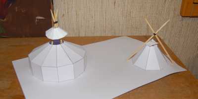 Die letzte Seite im PDF-Dokument ist als Boden für eine Jurte und eine Kohte gedacht. Diese Seite auf weissem Papier ausdrucken und hinterher grün anmalen.