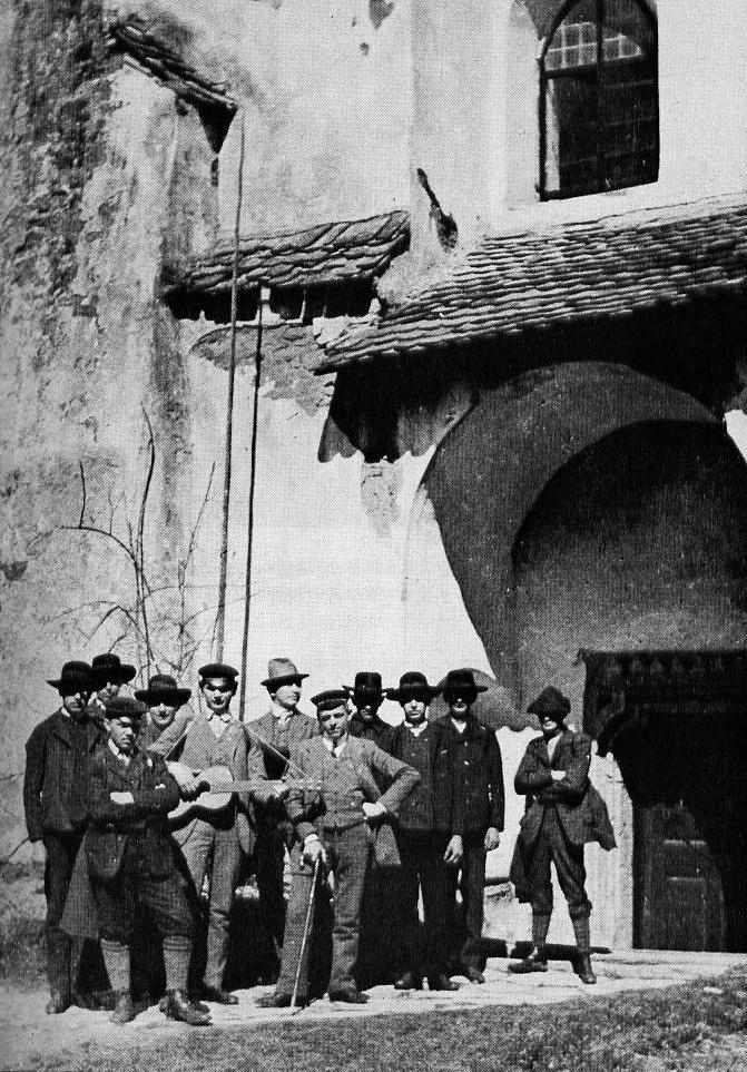 Wandervögel und Bauern vor einer Kirchenburg in Siebenbürgen 1911